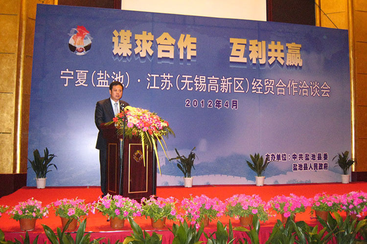 會上,無錫高新區(qū)經(jīng)貿(mào)局長致辭,鹽池縣縣長介紹了當(dāng)?shù)氐母艣r,觀看了寧夏鹽池縣專題宣傳片。公司常務(wù)副總經(jīng)理王眉林代表公司作為企業(yè)代表上臺交流發(fā)言,代表公司向參會人員簡要介紹了公司的概況,表達(dá)了對寧夏鹽池區(qū)委、區(qū)政府大力支持的感謝,衷心地祝愿雙方合作成功,發(fā)展共贏。